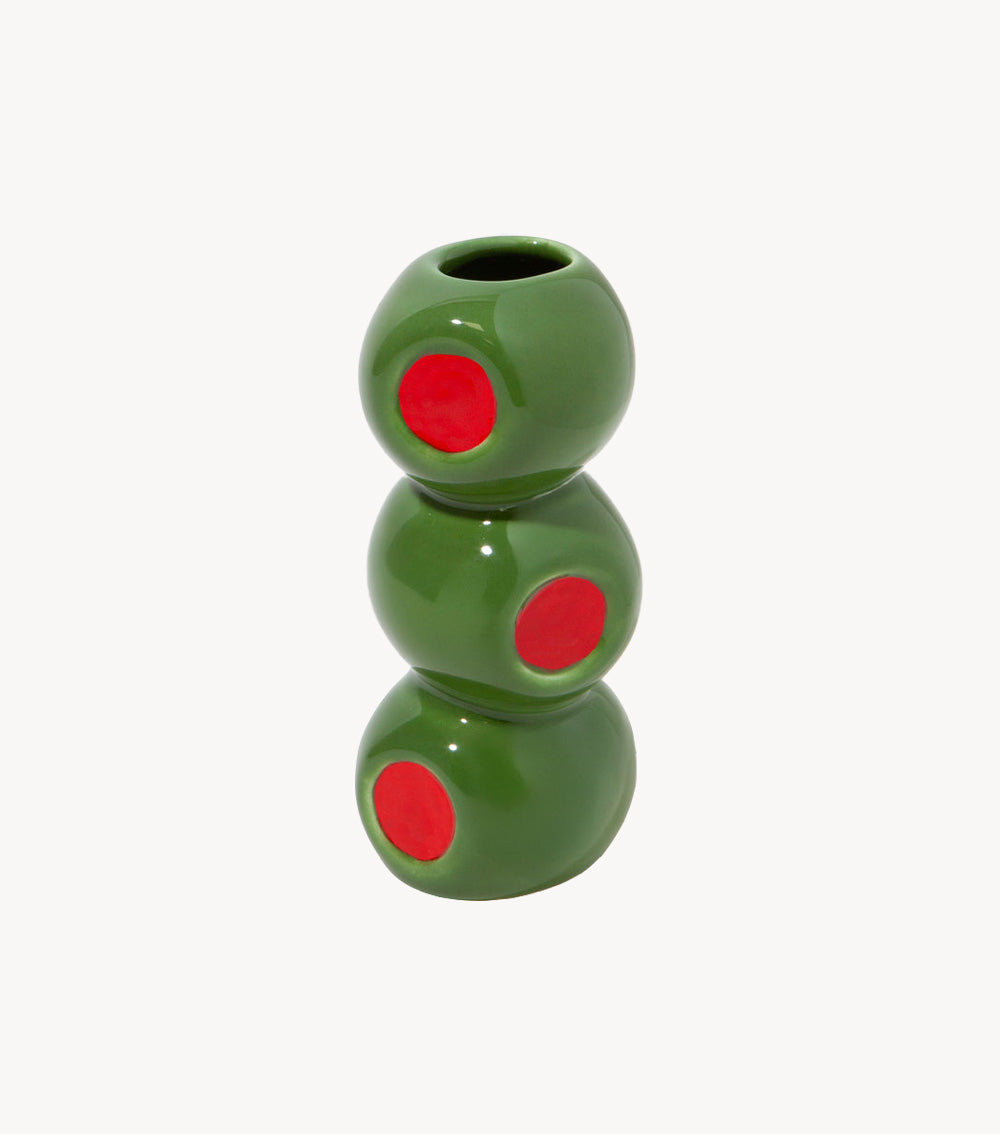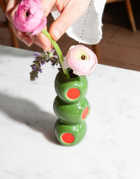 This small olive vase is a color-pop dream for your shelf or table. Small in size, big on design.