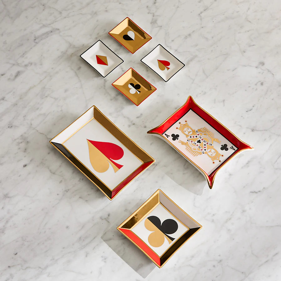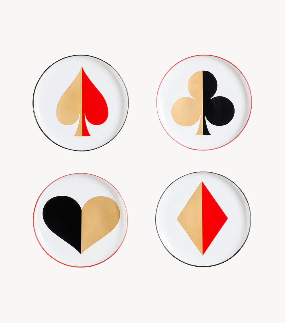 Crafted from high-fired porcelain and treated to a bold black, white, red and sparkly real gold palette, our Dealer's Choice Canapé Plate Set is perfect for parties, desserts, or diminutive snacks.