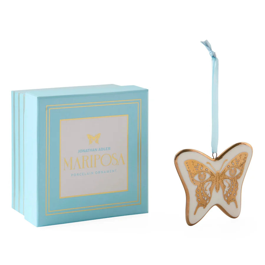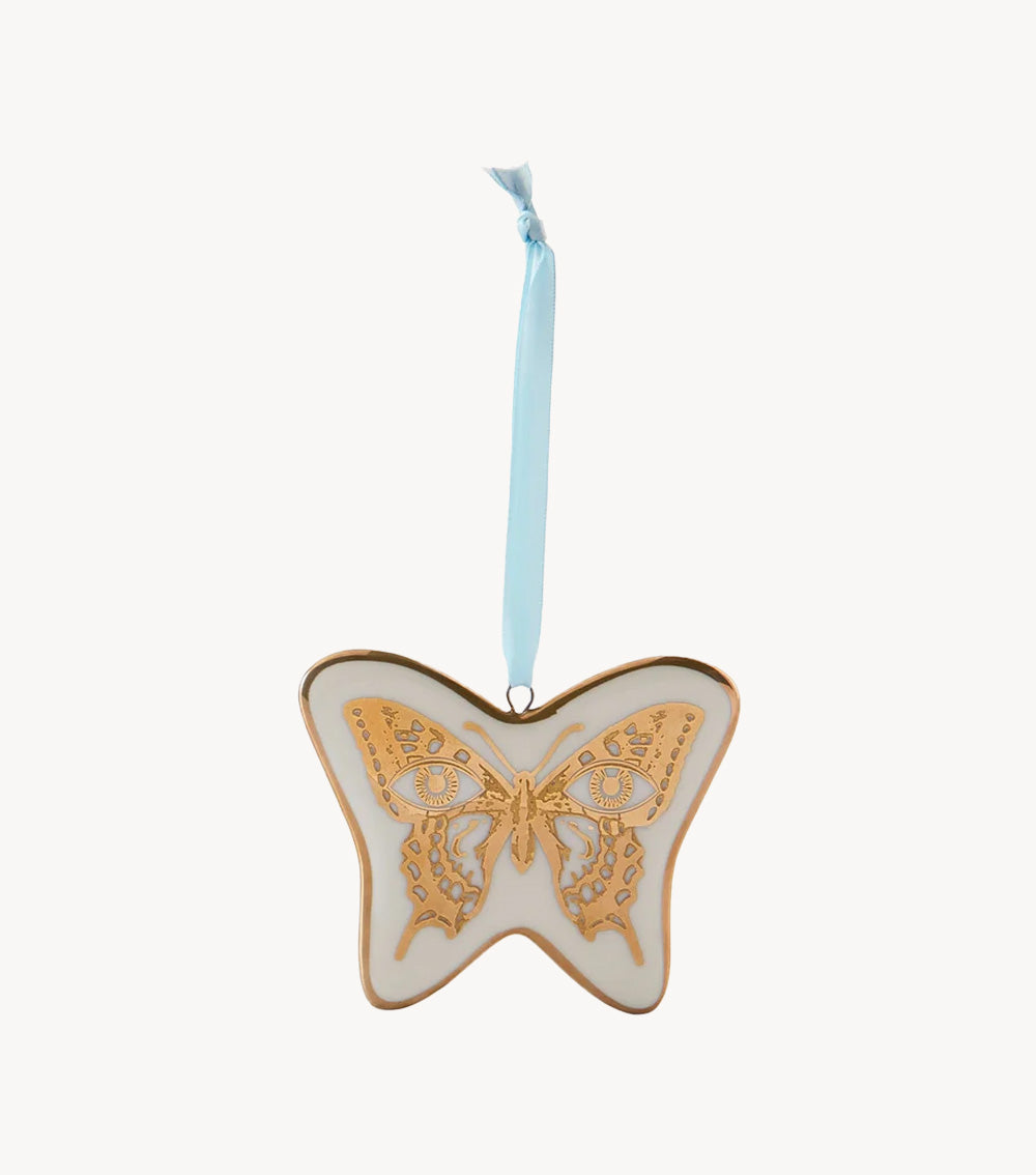 The glittering gold butterfly shines on a classic glossy ivory background. Crafted from glazed porcelain and fixed with a matte satin ribbon tie. Perfect for decking your halls, mantels, trees, and wreaths. Packaged in a bow-ready box that's perfect for gifting and storing between seasons.