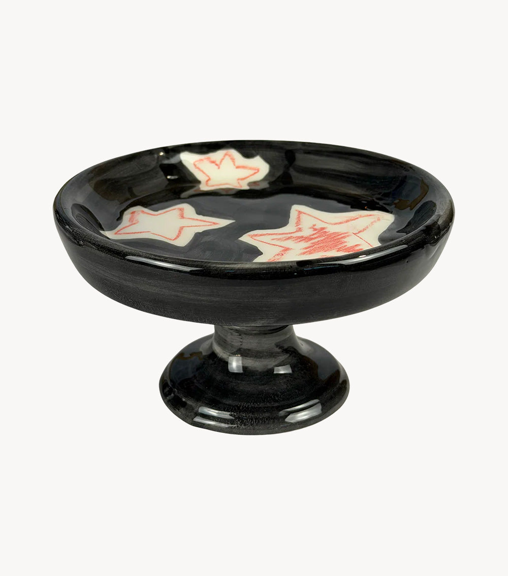 15 cm wide and 9.5 cm tall, hand-painted in deep black and scattered with tiny red stars.